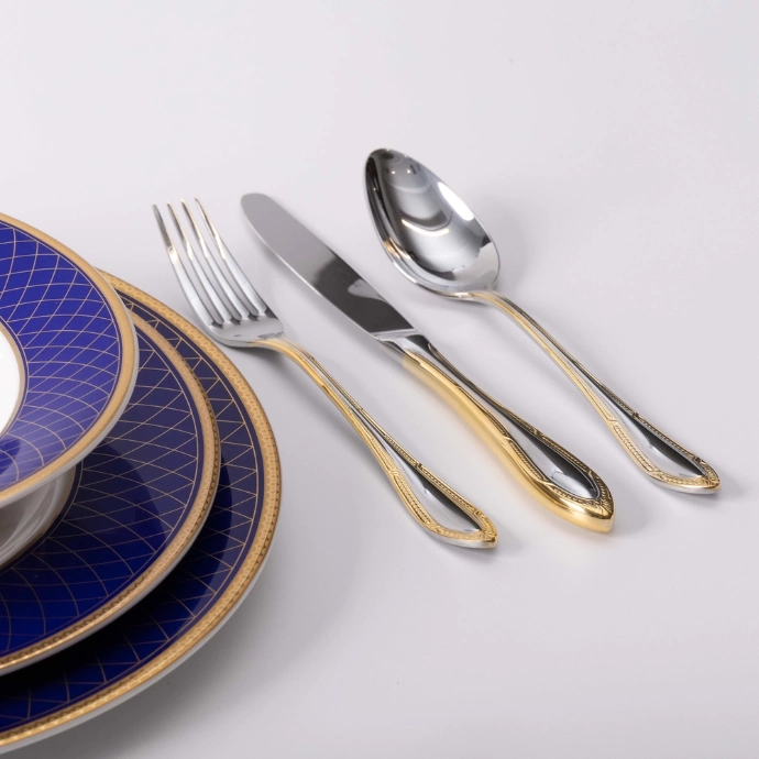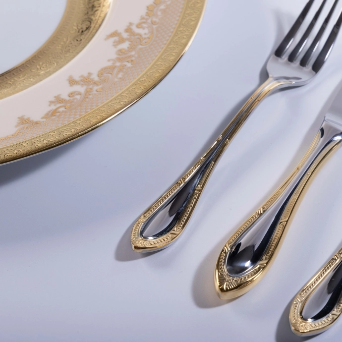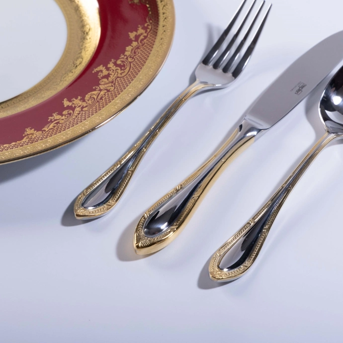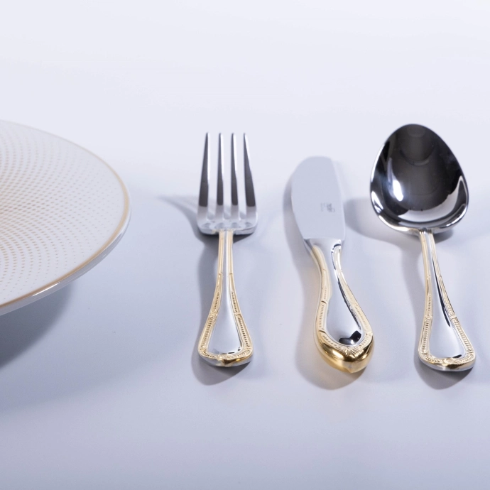 Seti Senator Decor Gold nga Zepter, është një koleksion luksoz dhe elegant, i dizajnuar për ata që kërkojnë cilësi të jashtëzakonshme dhe stil të rafinuar. Ky set është i bërë nga çeliku i klasit të lartë, me përfundim të artë që i jep një pamje të shëndritshme dhe të sofistikuar. Luga, thika dhe piruajt kanë një dizajn të përsosur dhe janë të pajisura me doreza ergonomike, për komoditet maksimal gjatë përdorimit.